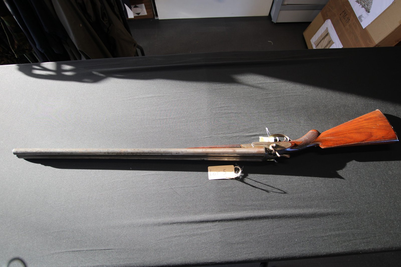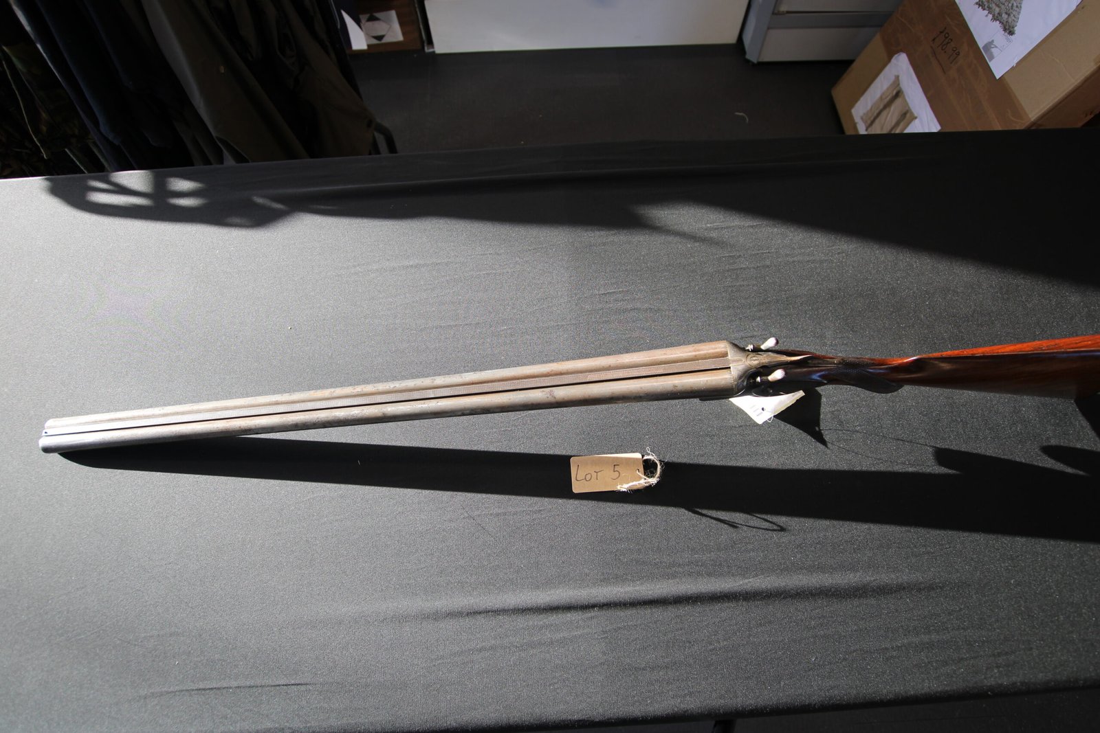 Barrels have lost most of the blue/brown and one screw head is missing on the left hammer, the stock has a chip missing on the toe